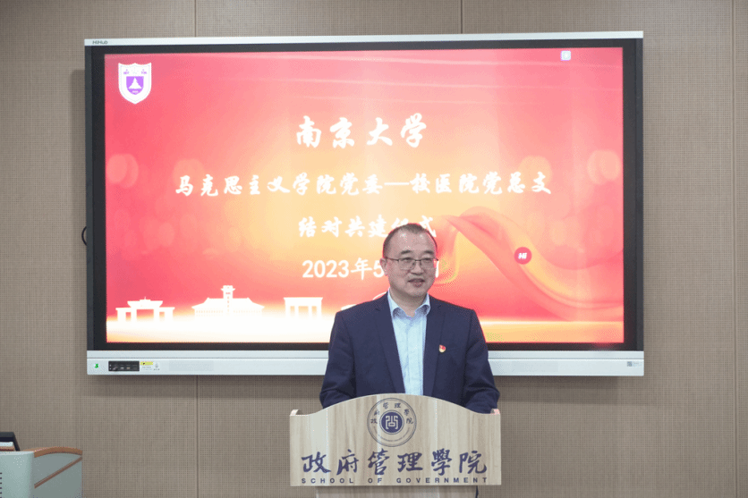 On the afternoon of May 4, 2023, which marked Youth Day, the CPC Committee of Nanjing University (NJU) School of Marxism and the General Party Branch of Nanjing University Hospital held a ceremony of pairing-up and co-building on NJU Xianlin Campus. Over fifty people attended the event, including Tang Shaoqiu (secretary of the General Party Branch and the Director of Nanjing University Hospital), Cheng Hao (deputy secretary of the General Party Branch and deputy director of Nanjing University Hospital), Sun Xiufang (deputy director of Nanjing University Hospital), Wang Jianhua (secretary of the CPC Committee of NJU School of Marxism), Hu Daping (dean of NJU School of Marxism), as well as representatives from both organizations who are members of the Party. Shi Yu, the deputy secretary of the CPC Committee of NJU School of Marxism, presided over the ceremony.