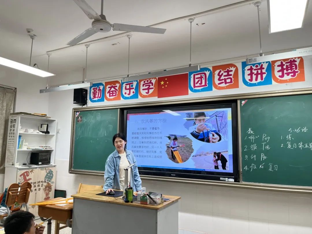 “风筝为什么能飞起来?”问题一抛出,同学们纷纷举起小手,想要分享自己的奇思妙想。“因为风把风筝吹起来”、“因为风筝很轻所以可以飞起来”、“因为我跑得快”同学们用朴素的语言道出了大道理,周亦垚讲师结合同学们的发言用四个力总结了风筝起飞的原理,风筝是在风力、牵引力、抗力和扬力的对抗作用下,才得以保持在空中的平衡。了解了原理后,周亦垚讲师便从季节与天气、场地、放收风筝的方法三方面回答了“怎样才能让风筝飞上天”这一问题,同时,周亦垚讲师也贴心的向同学们展示了放风筝的注意事项。