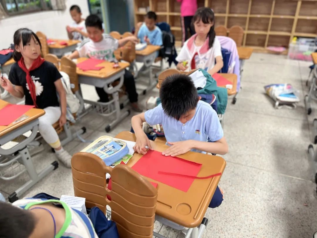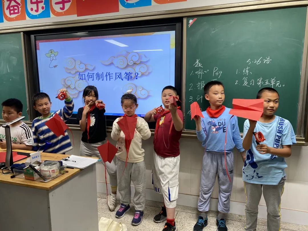 最后,来到了同学们最期待的制作环节,折纸、剪裁、钻孔、穿线一气呵成,周亦垚讲师向同学展示了风筝制作的整个过程。同学们按照步骤开始制作,“小尾巴放长一些”、“小孔钻上面一些”在周亦垚讲师的悉心教导下,一只只或是有着小彩虹图案,或是画着小蝴蝶图样的简易版风筝诞生在同学们手中。“飞起来咯!”有的同学已经迫不及待在教室外实验他的作品,即使雨天也浇不灭他们满满的热情。