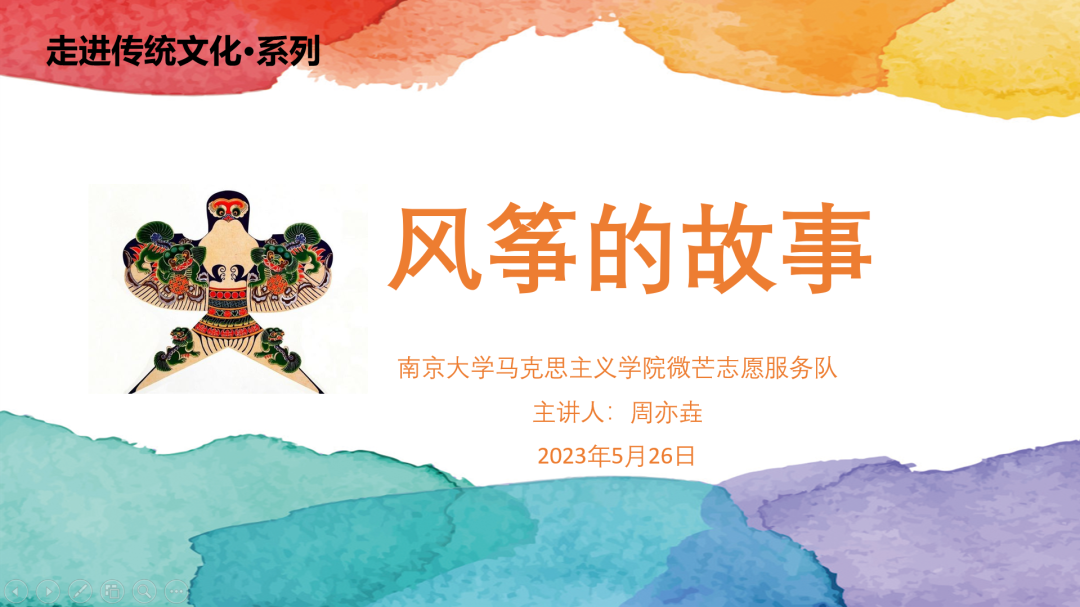 接着,周亦垚讲师从军事、通讯、科学、文化四方面向同学们介绍了风筝的贡献,特别是在文化贡献方面,潍坊风筝被列入第一批国家级非物质文化遗产名录。风筝作为中华优秀传统文化的一个代表,周亦垚讲师号召同学们要学习风筝文化,传承非遗文化,多多关注中华优秀传统文化,坚定文化自信,传承匠人精神。理论讲解的最后,周亦垚讲师通过问答的方式回顾了整节课程,帮助同学们加深了记忆。