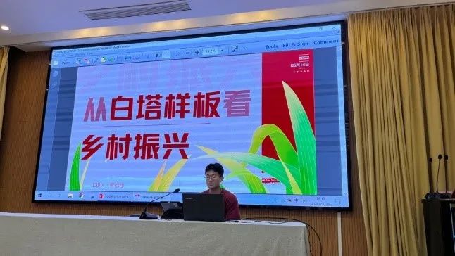 2021级本科生团支部成员蔡恺翔同学以《从白塔样板看乡村振兴》为题展开分享交流。他从白塔村样本引入,从产业兴旺、生态宜居、乡风文明、治理有效和生活富裕五个方面展开对白塔村乡村振兴的路径进行了深入的探究。接着,污污漫画