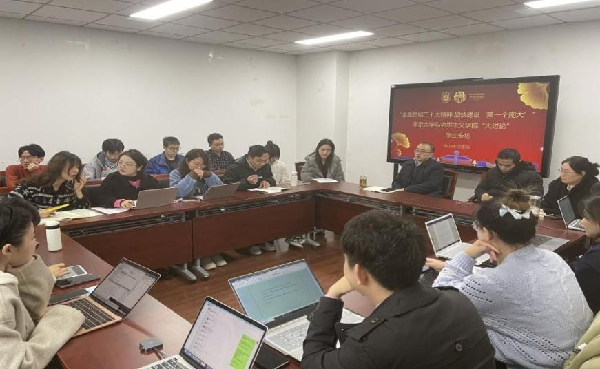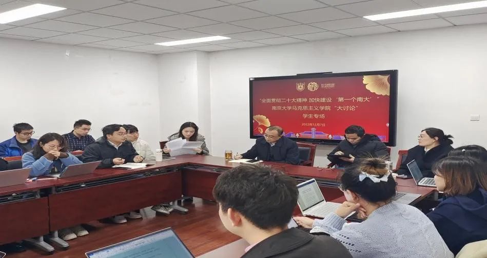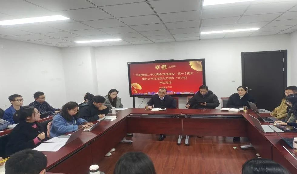 党委书记王建华老师,院长胡大平老师,党委副书记时昱老师,团委书记刘晶月老师出席会议。本硕博各年级学生代表在前期调研总结的基础上,结合自身学习和生活经历,对加快建设‘第一个南大’展开热烈讨论。