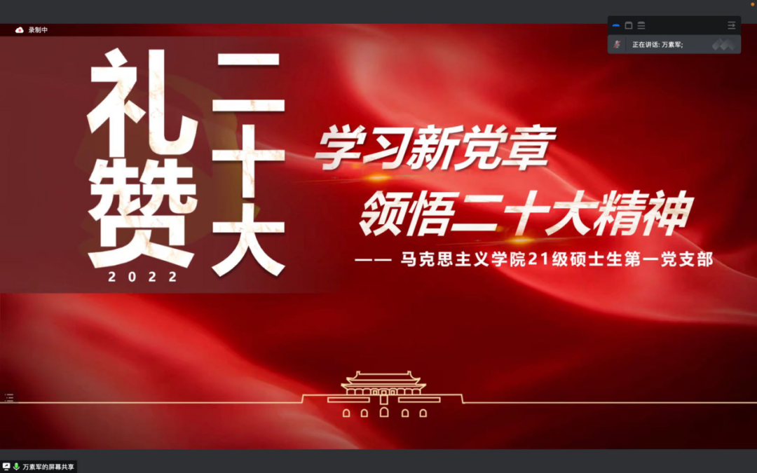 党章是全党必须共同遵守的根本的、最高的行为规范,是深入推进新时代党的建设的伟大工程的总遵循,是学习贯彻党的二十大精神的关键一环。为持续学习贯彻党的二十大精神,深入领会新修订的《中国共产党章程》,2022年11月27日晚,2021级硕士生第一党支部联合2021级硕士生第一团支部开展“学习新党章 领悟二十大重要精神”党团共建主题活动。本次活动由硕士生第一团支部书记丁政方同学主持,由硕士生第一党支部万素军同学带来新党章学习主题分享。
