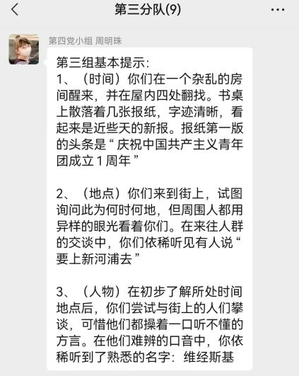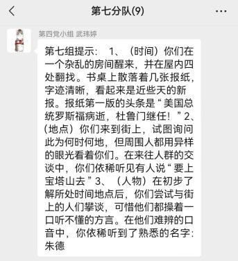 宣讲之后,第四党小组依据宣讲内容设置了两道题目,各分队在提前建好的队伍群内进行充分的交流讨论后,确定最终答案。在各组回答完毕之后,根据答题正误来记录各组的积分情况,作为第一轮获取解谜线索的凭证。