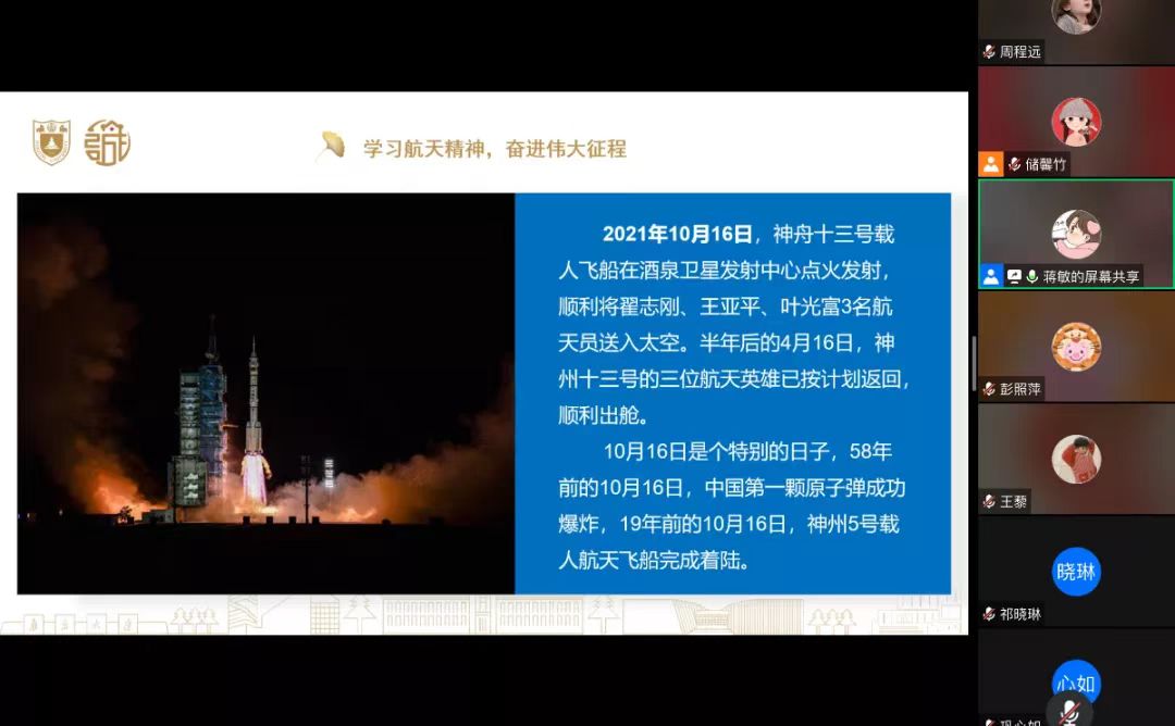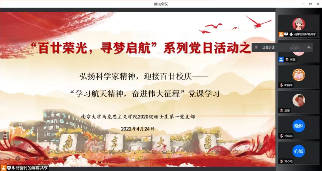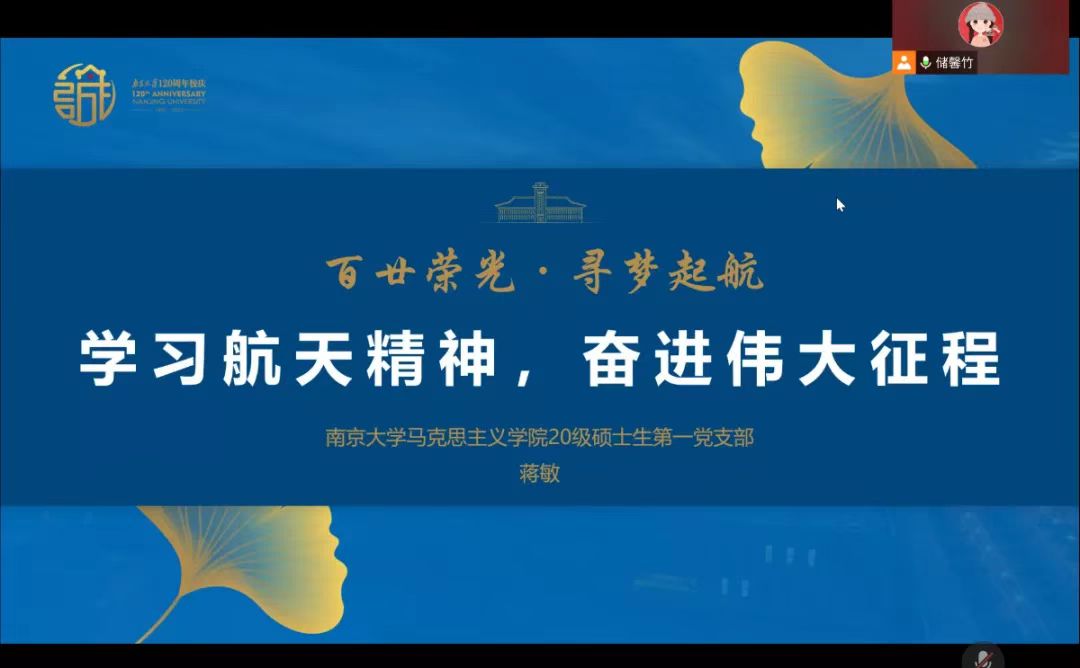 2020级硕士生第一党支部书记储馨竹主持,2020级硕士生第一党支部宣讲团讲师蒋敏带来了关于“学习航天精神,奋进伟大征程”的党课宣讲。