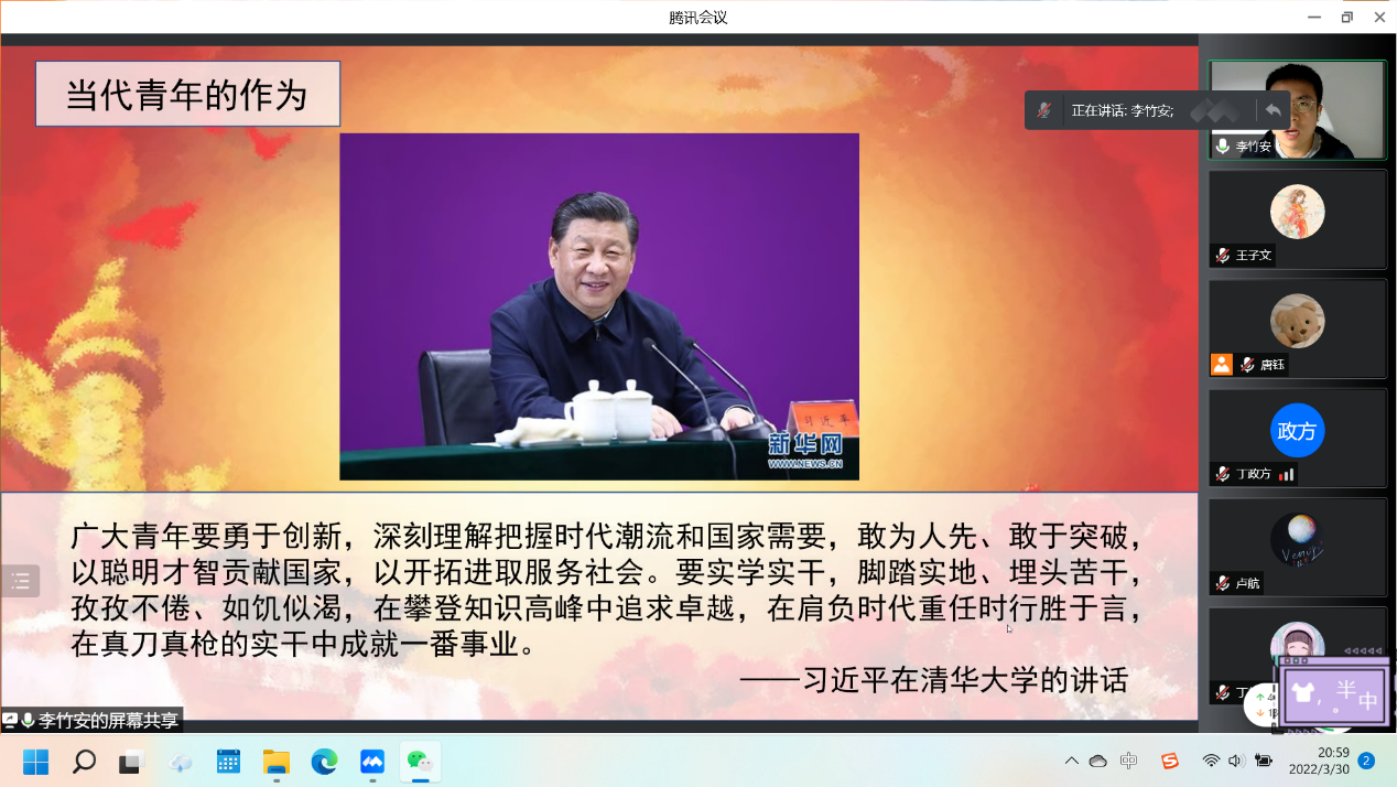 21级硕士研究生第一党支部第一党小组的徐雨晴、覃钰淇同志领读了文章的第一、二部分内容,唐钰同志介绍了第三、四部分内容,增强了同志们对这篇具有重大历史意义文章的认识和理解。